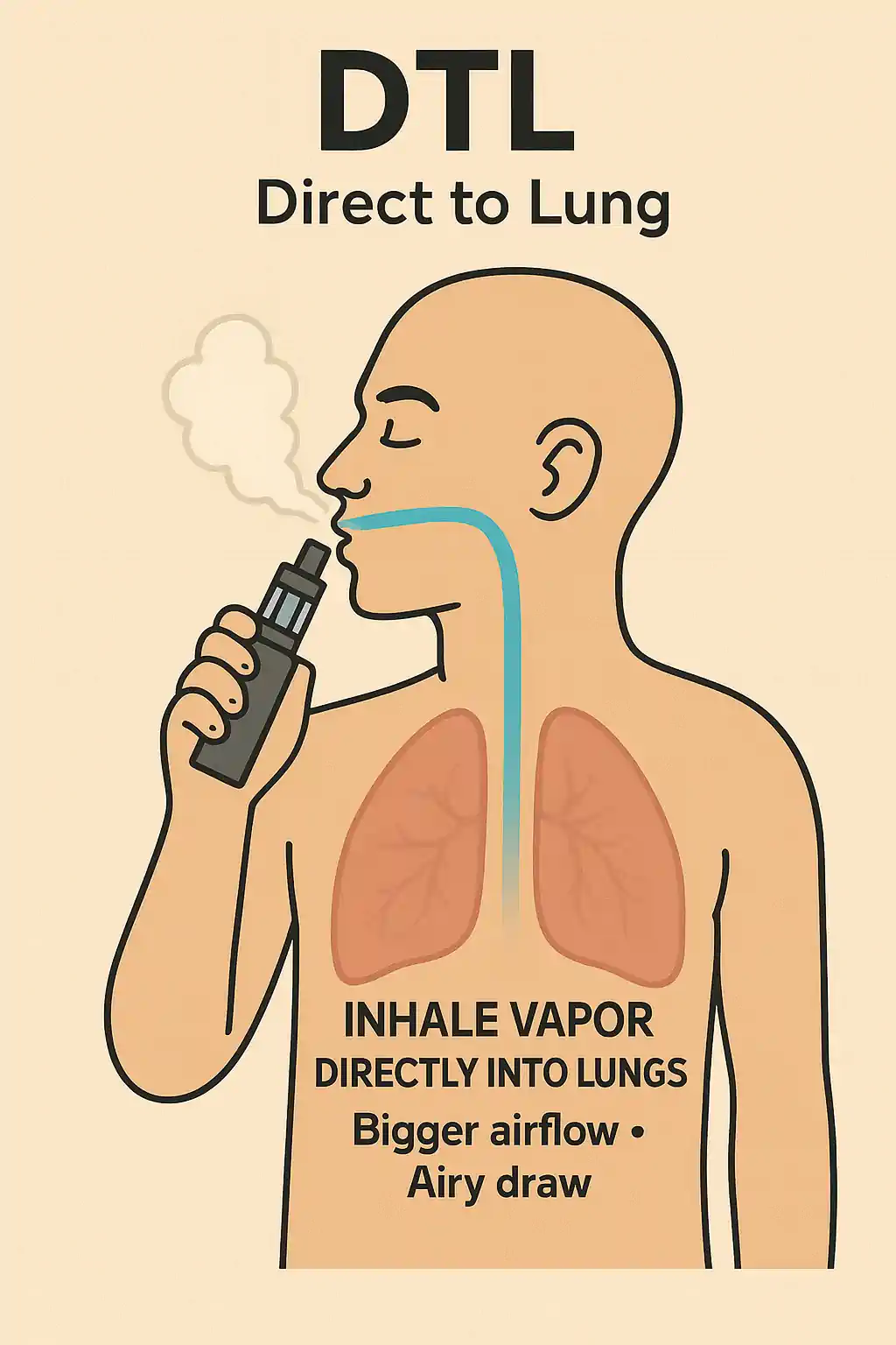 Direct To Lung (DTL) vaping is exactly what it sounds like: when you inhale vapor straight down into your lungs like breathing normally. It’s a more open, airier style that creates larger clouds and tends to feel smoother on the throat.