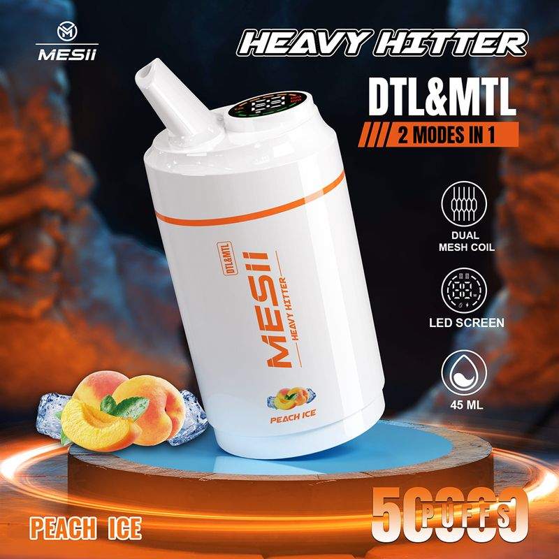 Mesii Shisha Heavy Hitter 50000 Puffs  offers an extended vaping experience with 50,000 puffs and a 45mL e-liquid capacity. The smart LCD display shows battery and e-liquid levels, while Type-C charging ensures quick recharges. Furthermore, the adjustable airflow feature greatly enhance your vaping experience, can adjust between MTL or DTL capability. Featuring dual 0.9Ω mesh coils, and an 850mAh rechargeable battery, it delivers flavors beyond your imagination.